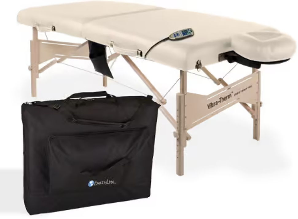 Constructed from managed forest hardwoods and eco-friendly upholstery, the Earthlite Vibra Therm table appears sturdy and environmentally responsible. The table is also notably lightweight at 43 lbs, making it portable for those who offer mobile massage services. The complete professional package includes a headrest, face cushion, and a rugged carry case — basically, everything you need to get started.