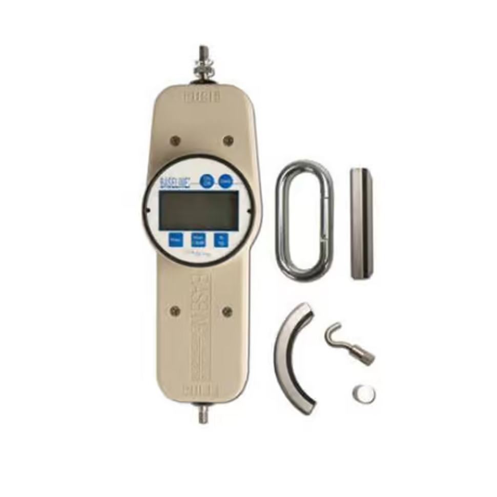 The package includes the dynamometer with a digital gauge, three push pads (one padded curved, one padded straight, and one 1 cm-squared circular), one pull hook, one snap-lock hook, and a carrying case. You can also add a single or dual grip handle for applying larger loads, and you have the option to choose from one of four size options.