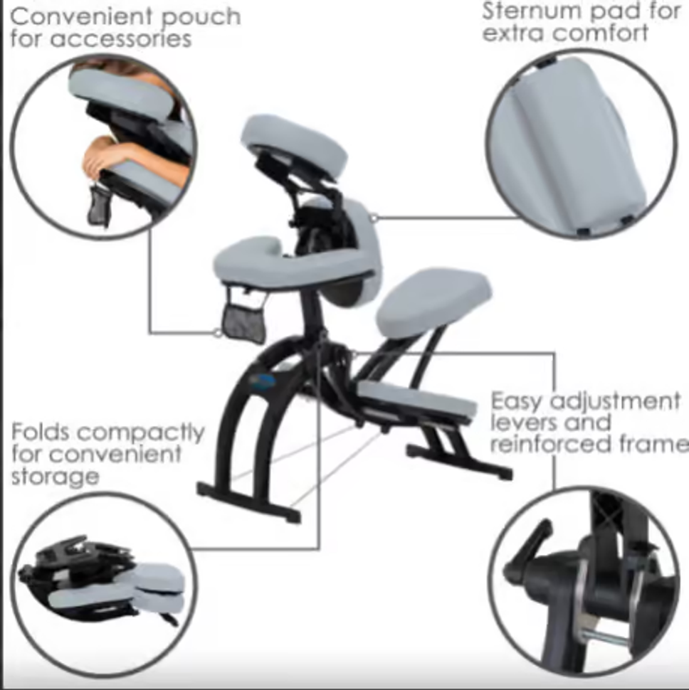 The chair includes an essential oil well – a unique feature that therapists incorporating aromatherapy into their sessions will appreciate. A detachable pouch for personal items ensures clients’ convenience during the session.